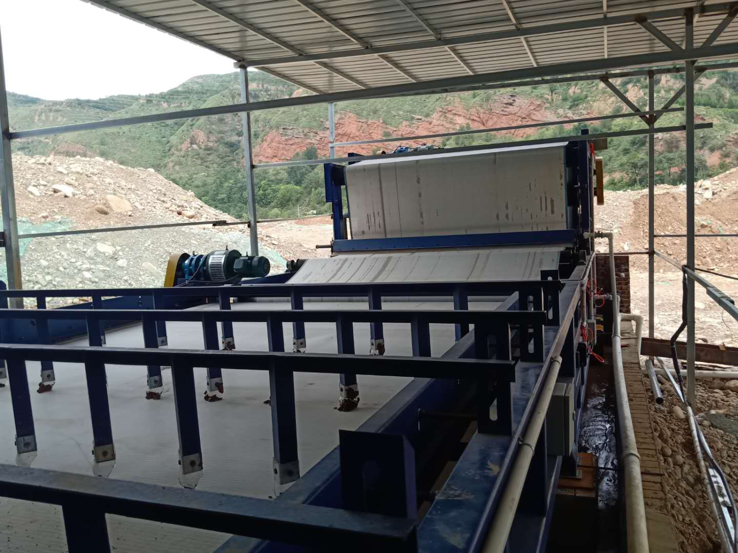 經過(guò)絮凝處(chù)理的汙水形成絮團,使汙水中的固體顆粒與水分離,通過布泥機構進入重力脫水區,並均勻分布(bù)到整個工作(zuò)麵的寬度上。在水的重力作用下,自由(yóu)水與絮團分離,經(jīng)濾帶脫去濾(lǜ)漿中的大(dà)部分自由水。在(zài)這個過程中,濾帶上(shàng)方交錯排列的耙(pá)泥係統在汙泥中犁出水道,濾帶下方的刮水組件支撐濾帶,並將濾液刮走,使更多的自由水加速排放而改善脫水效果。該過程完成後,汙泥基本失去流(liú)動性,有利於後續的壓榨脫水。帶有濃(nóng)縮機的(de)壓濾機,其濃縮部分的功能與上述基本相(xiàng)同,但(dàn)它具有(yǒu)單獨的張緊機構和調偏機構。同時由於其濾帶結(jié)構特殊,運行速度較快,重力脫水效果(guǒ)更佳。